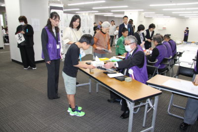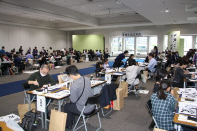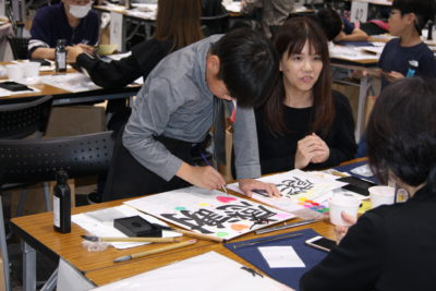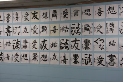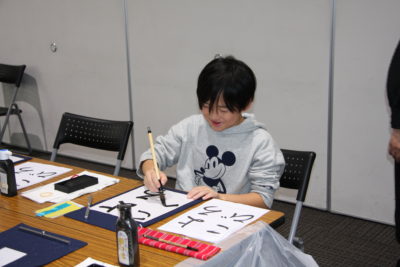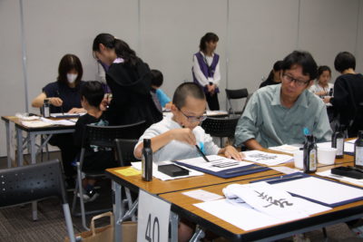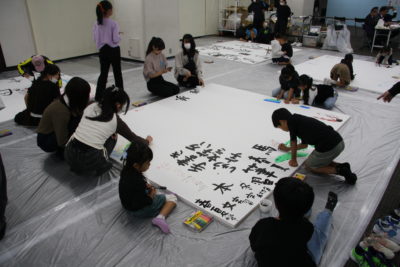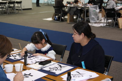 主催者幹部の挨拶の後は、恒例の色紙作品の揮毫です。今回のテーマに沿った『つなぐ』『結』『喜』などの字を楷書や篆書、仮名など、様々な書体で書き上げました。みんなで楽しく筆で文字を書き、何度も練習を重ねた中から清書の作品を一点選び、担当の先生方に印を押してもらいました。作品は、その場で特設パネルに展示しました。