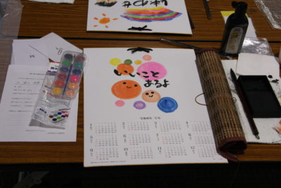 今回のもう1つの主題は、「大判のカレンダー付色紙の作成」です。絵の具や墨を使って、心に思い浮かぶ文字や言葉、絵などを自由に書き個性豊かな2026年のカレンダーが仕上がりました。