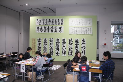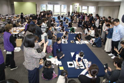 主催者幹部の挨拶の後は、恒例の色紙作品の揮毫です。今回のテーマに沿った『つなぐ』『結』『喜』などの字を楷書や篆書、仮名など、様々な書体で書き上げました。みんなで楽しく筆で文字を書き、何度も練習を重ねた中から清書の作品を一点選び、担当の先生方に印を押してもらいました。作品は、その場で特設パネルに展示しました。